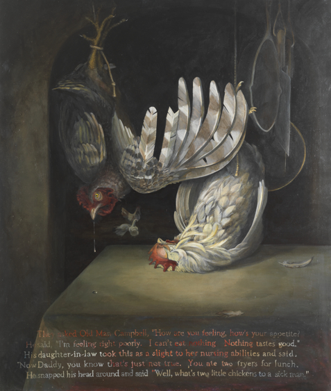 2001 oil on canvas mounted on panel 43 x 37" Detail of chicken heads Detail of drool Text reads as follows: They asked Old Man Campbell, "How are you feeling? How's your appetite? He said, "I'm feeling right poorly. I can't eat nothing. Nothing tastes good." His daughter-in-law took this as a slight to her nursing abilities and said, "Now Daddy you know that's just not true. You ate two fryers for lunch." He snapped his head around and said, " Well what's two little chickens to a sick man." |