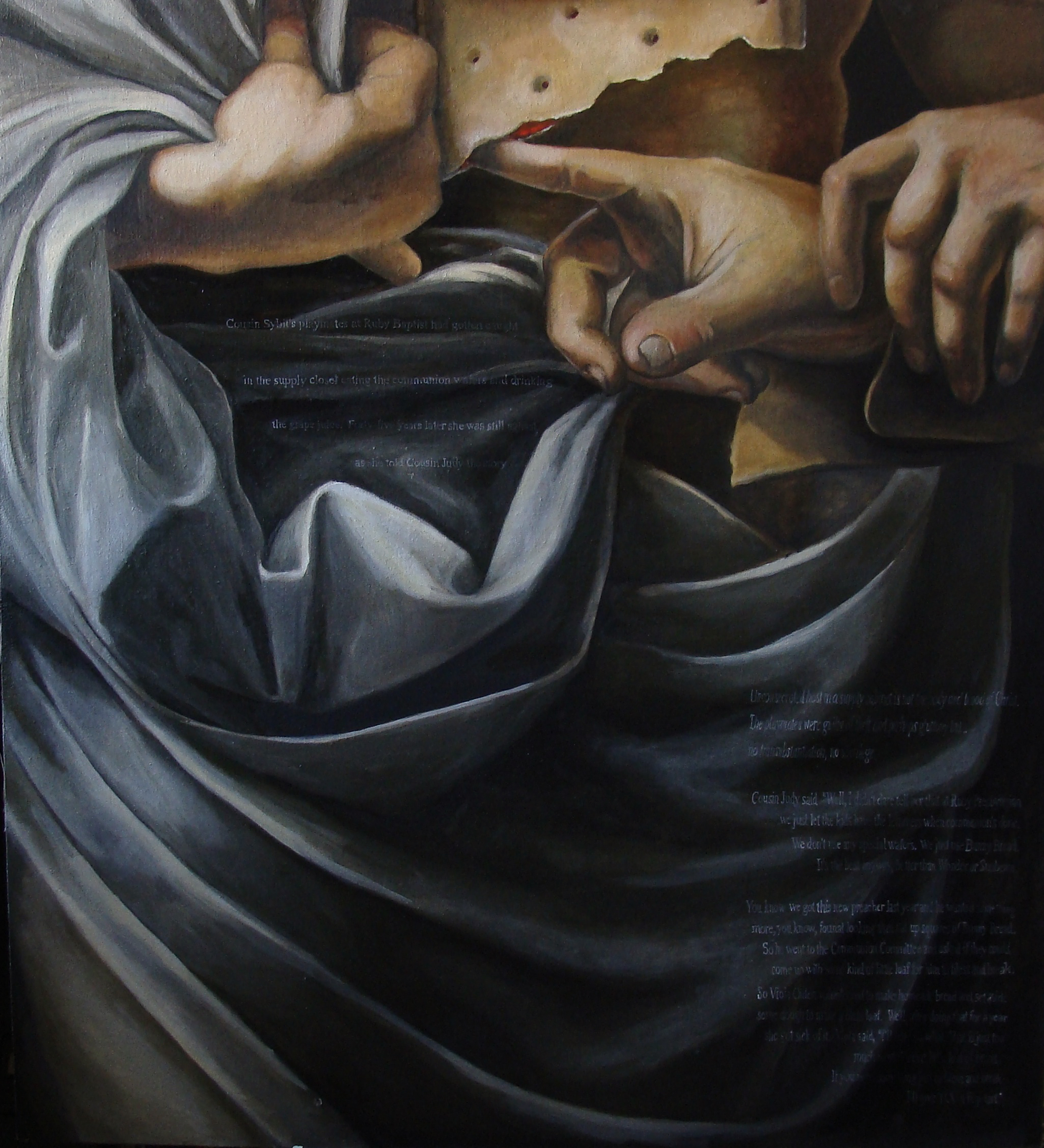 2006 oil on canvas mounted on panel 2 panels: image 3 x 2', text 1 x 2' text reads: "During the Depression, staples came in fabric bags. Folks cut clothes from them. My Grandmother was married in a soda sack suit. Her underpants were sugar. Papa was 25 but she was 15 when they eloped. When they told her sister, Nettie, what they'd done She said, "Well what'd you get her with -- an ice cream cone?" |