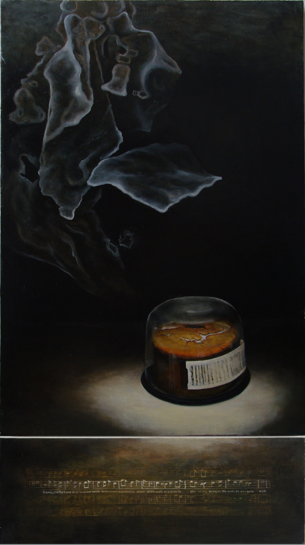 2007 oil on canvas over panel 36 x 18" Text reads as follows: "Come and the Lord shall feed our souls With more substantial meat With such as Saints in glory love With such as angels eat." |