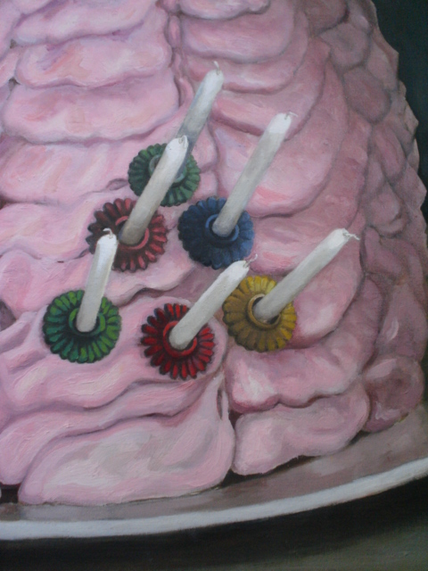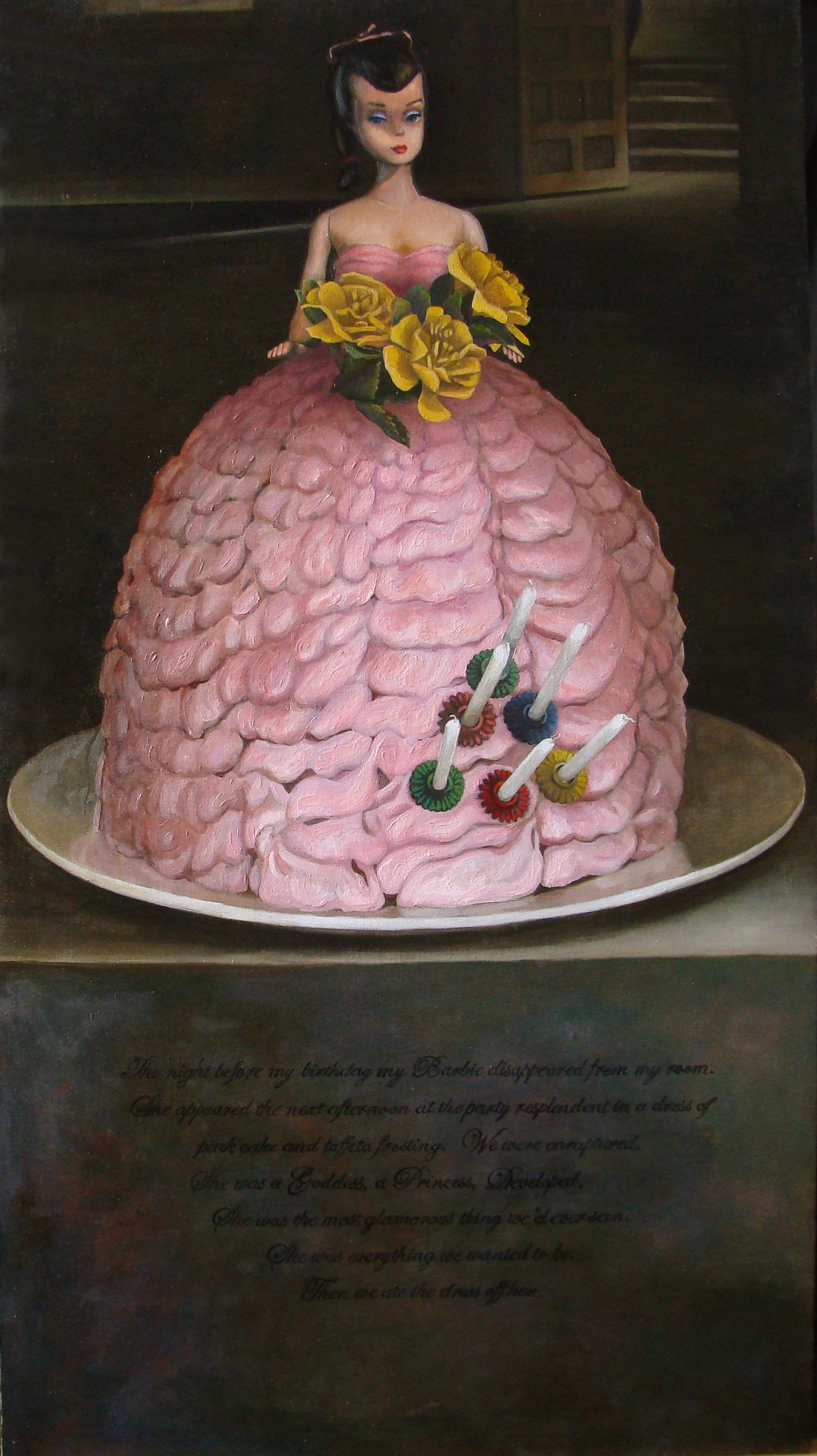 2001 oil on canvas mounted on panel 47 x 26" Detail of Barbie head Detail of candles Text reads as follows: The night before my birthday, my Barbie disappeared from my room. She appeared the next afternoon at the party resplendent in a dress of pink cake and taffeta frosting. We were enraptured. She was a Goddess, a Princess, Developed. She was the most glamorous thing wed ever seen. She was everything we wanted to be. Then we ate the dress off her. Art historical reference, "Las Meninas" Classical reference, "Tennessee Williams' Suddenly Last Summer and the Rites of Dionysus" by Janice Siegel |
